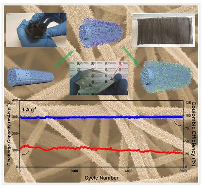 針對以上問題,昆士蘭大學(xué)王連洲課題組胡宇翔等研究人員和南京航空航天大學(xué)彭生杰教授課題組合作,設(shè)計了一種具有出色機械柔性和多級孔結(jié)構(gòu)的非石墨類自支撐,無粘結(jié)劑電極(Co9S8@CNT-CNF),并首次運用在鋁離子電池中。這一正極材料憑借自身結(jié)構(gòu)優(yōu)勢有效避免了普通電極的集流體和粘結(jié)劑在鋁離子電池中的副反應(yīng)對整體電池性能的影響。加上其多孔和碳支持的整體結(jié)構(gòu)有利于電解液滲透、更多反應(yīng)位點暴露和反應(yīng)電子傳輸,極大的加快了電極動力學(xué)的過程。在100 mA g-1電流密度下初始放電容量高達315 mAh g-1,并且在200圈循環(huán)后依舊保持297 mAh g-1的容量。即使把充放電速度提高10倍在1 A g-1的電流密度下,初始放電容量依舊在154 mAh g-1并且在長達6000圈的循環(huán)后依舊保持87 mAh g-1的容量,是目前報道的最為穩(wěn)定的非石墨類鋁電池材料之一。文中通過對循環(huán)后電極的系統(tǒng)表征和與初始電極的對比也論證了這一正極材料在鋁離子電池中的出色電化學(xué)穩(wěn)定性機理。 綜上,這一新型的自支撐,無粘結(jié)劑電極(Co9S8@CNT-CNF)是一類具有較好前景的鋁離子正極材料,也為之后鋁離子正極材料的探究提供了一條借鑒思路。相關(guān)文章在線發(fā)表在Advanced Materials(DOI: 10.1002/adma.201703824)上。