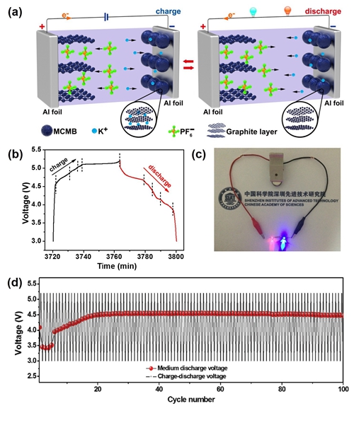 結(jié)合鉀離子電池與雙碳電池各自的優(yōu)點(diǎn),唐永炳及其團(tuán)隊(duì)成員季必發(fā)、張帆等人成功研發(fā)出一種新型高性能、低成本、環(huán)保友好的雙碳鉀離子電池。該電池采用中間相碳微球?yàn)樨?fù)極,膨脹石墨作為正極;電解液采用廉價(jià)易得的六氟磷酸鉀作為鉀鹽電解質(zhì)溶于有機(jī)溶劑中。其反應(yīng)機(jī)理為:充電時(shí),電解液中的鉀離子運(yùn)動(dòng)到中間相碳微球負(fù)極表面,并嵌入至石墨層中,同時(shí)六氟磷酸根陰離子插層到正極石墨中;放電時(shí),鉀離子從負(fù)極石墨層中脫出,同時(shí)正極石墨中的六氟磷酸根脫嵌回到電解液中。