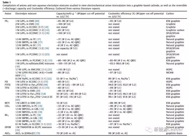 下圖是一些常見的應用在雙離子電池的電解液和它們在不同的石墨材料中的嵌入電勢「2」,從這張表上我們可以注意到,常見的PF6+酯類電解液在雙離子電池中,PF6嵌入到石墨結(jié)構(gòu)中的電勢都達到5V以上,這也導致了一個嚴峻的問題——高電壓導致的電解液不穩(wěn)定,從而使得電池在循環(huán)中庫倫效率持續(xù)下降,循環(huán)性能較差。近年來隨著離子液體技術(shù)的不斷發(fā)展,離子液體的高熱穩(wěn)定性,低粘度和寬電化學窗口,讓我們看到了雙離子電池的希望。