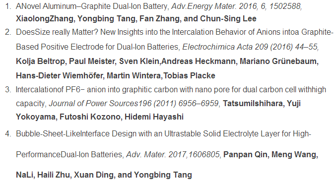 儲能領(lǐng)域從來都不缺乏攪局者,最近幾年新興的雙離子電池就是其中之一。與鋰離子電池的正負極之間只有Li+在參加反應不同,雙離子電池的充電的過程中,陰離子在電場的作用下向陽極遷移,嵌入到陽極結(jié)構(gòu)之中,陽離子向陰極遷移,嵌入到陰極之中,放電的過程則與之相反,陽極和陰極中的離子脫出,回到電解液中,恢復電解液的濃度。目前雙離子電池使用的正極材料主要是石墨材料,其實陰離子能夠嵌入到石墨結(jié)構(gòu)中早在1938就由Ru?dorff和Hofmann發(fā)現(xiàn),但是由于陰離子的嵌入電勢較高,因此早期的雙離子電池的電解液使用高濃度的酸溶液作為電解液,這會帶來很大的安全隱患。直到90年代,隨著鋰離子電池的商業(yè)化應用,人們發(fā)現(xiàn)如果將鋰離子電池的正極替換為能夠嵌入陰離子的石墨類材料,可以獲得較高電壓的雙離子電池。隨后的幾十年人們開始對雙離子電池展開了深入的研究,特別是對陰離子嵌入到石墨結(jié)構(gòu)中的機理進行了深入的研究「1」。