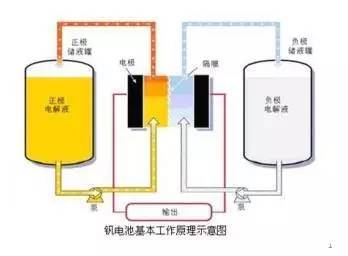 目前應(yīng)用狀況比較好的是全釩液流電池,其正負(fù)極均使用釩材料。記者了解到,全釩液流電池的基本構(gòu)造是一個(gè)可選擇性傳導(dǎo)氫離子的膜隔開的腔體(正、負(fù)極),腔體的兩側(cè)各有一個(gè)固體電極。通過腔體兩側(cè)加入的不同價(jià)態(tài)的釩離子發(fā)生化學(xué)反應(yīng)產(chǎn)生電能,而后通過電極將電能輸出到外部電路,對(duì)全釩液流電池充電時(shí),其反應(yīng)過程正好相反。
