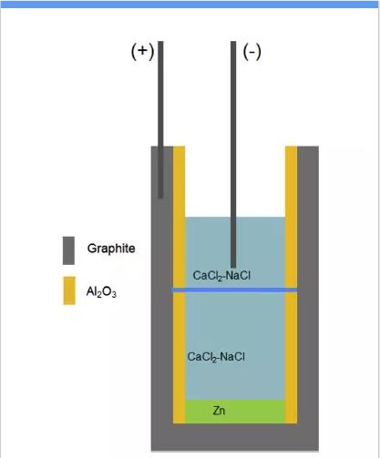 該電池包含一個石墨坩堝,一個氧化鋁絕緣桶,孔隙率為300ppi氧化鎂穩(wěn)定氧化鋯薄片,Mo金屬電流導線,電解液采用NaCl: CaCl2 (50:50 mol %),熔點為500℃,電池的工作溫度為560℃。首先,將鋅放置于電池的底部,并加入相應數(shù)量的干燥NaCl: CaCl2鹽,然后該電池被移入到管式爐中,加熱到560℃,正極通過石墨引出,Mo線作為負極,將Mo線插入到熔鹽中2cm。在充電的過程中,熔鹽中的Na+還原成為Na金屬負極,而Zn被氧化成為Zn2+,進入到熔鹽中,放電過程則剛好相反。