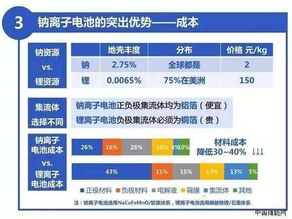 該體系選用資源豐富的鈉作為活性元素,正負(fù)極材料分別選用成本低廉的鈉銅鐵錳氧化物和無煙煤基軟碳,從而具備了明顯的成本優(yōu)勢(shì)。目前鈉離子電池的能量密度已達(dá)到120瓦時(shí)/公斤,是鉛酸電池的3倍左右。低成本鈉離子電池有望在低速電動(dòng)車、電動(dòng)船、家庭儲(chǔ)能、電網(wǎng)儲(chǔ)能等領(lǐng)域獲得應(yīng)用。