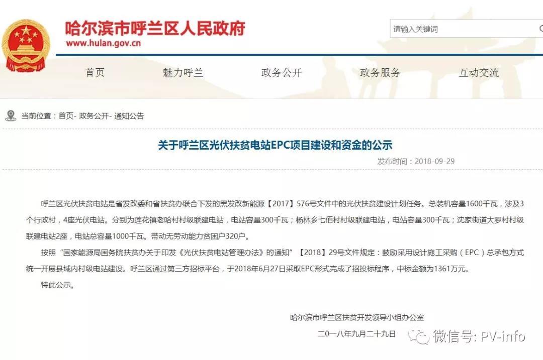 按照“國家能源局國務(wù)院扶貧辦關(guān)于印發(fā)《光伏扶貧電站管理辦法》的通知”【2018】29號文件規(guī)定:鼓勵(lì)采用設(shè)計(jì)施工采購(EPC)總承包方式統(tǒng)一開展縣域內(nèi)村級電站建設(shè)。呼蘭區(qū)通過第三方招標(biāo)平臺,于2018年6月27日采取EPC形式完成了招投標(biāo)程序,中標(biāo)金額為1361萬元。