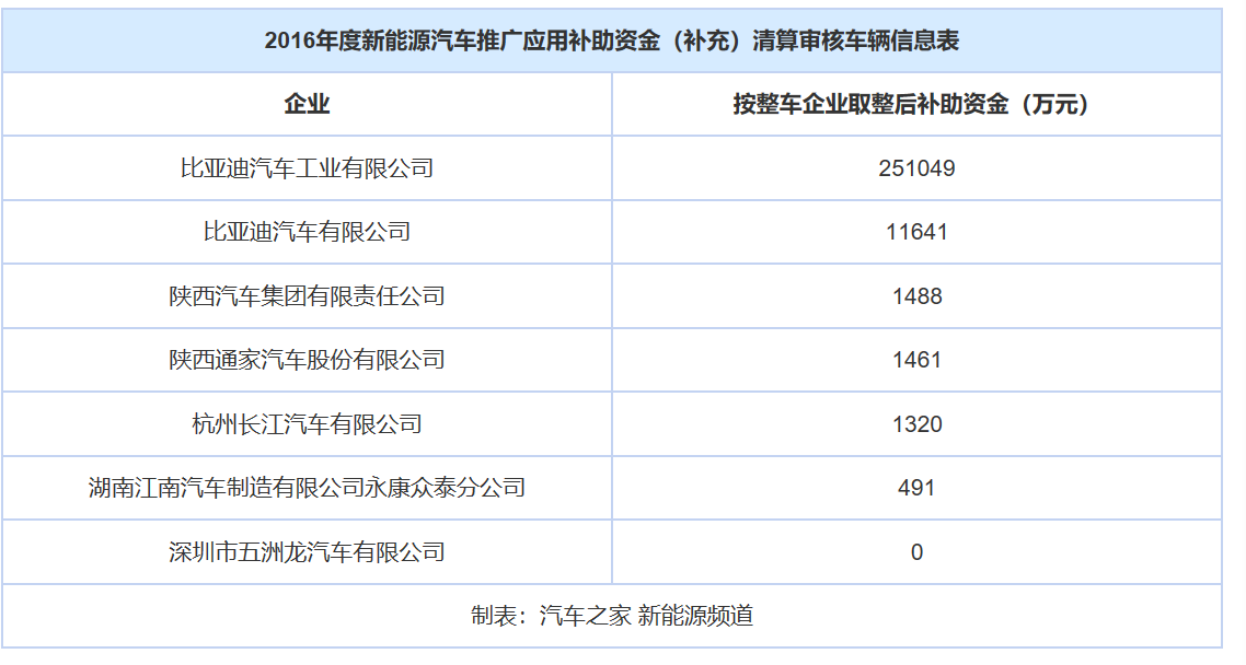 此次2016年新能源企業(yè)申報推廣數(shù)為10952輛,企業(yè)申請清單資金為26.6億元,最終專家組核定推廣數(shù)為10876輛,減去了76輛不符合補貼要求的車型,應(yīng)清算補助資金26.5億元。該批次并非為2016年的全部補貼車型,此前已有4批公示發(fā)放。