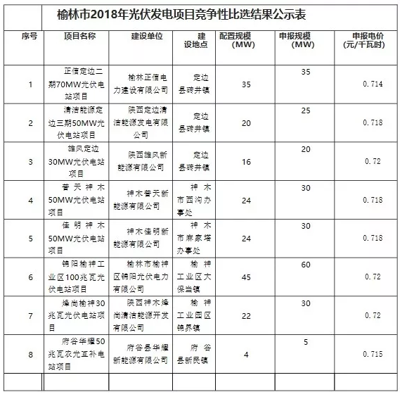 中國(guó)儲(chǔ)能網(wǎng)訊:2018年9月19日至2018年9月21日,榆林市發(fā)改委根據(jù)《關(guān)于印發(fā)2018年榆林市光伏發(fā)電項(xiàng)目競(jìng)爭(zhēng)配置辦法的通知》(榆政發(fā)改發(fā)〔2018〕380號(hào))要求,對(duì)參選項(xiàng)目進(jìn)行了審核并形成了配置意見(jiàn),電站價(jià)格0.714元至0.72元。