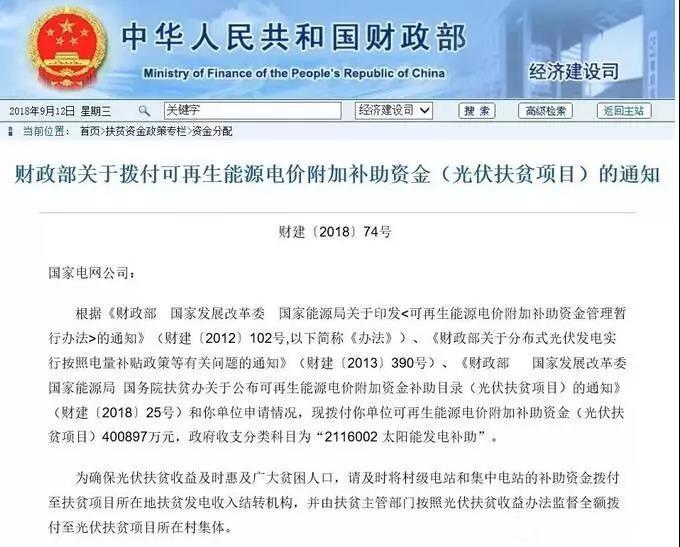 其實,早在今年3月,財政部就下發(fā)了《關(guān)于公布可再生能源電價附加資金補助目錄(光伏扶貧項目)的通知》(財建〔2018〕25號),將符合條件的光伏扶貧項目列入可再生能源電價附加資金補助目錄,明確對列入可再生能源電價附加資金補助目錄內(nèi)的光伏扶貧項目,將優(yōu)先撥付用于扶貧部分的補貼資金。
