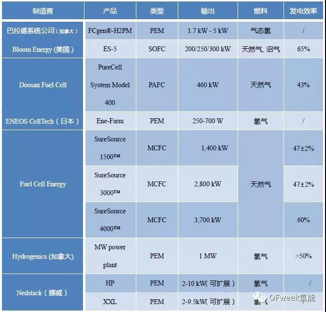 以上三家企業(yè)是固定式燃料電池的主要參與者,都推出了成熟的商業(yè)化產(chǎn)品,OFweek氫能將全球商業(yè)化固定式燃料電池型號匯總如下表: