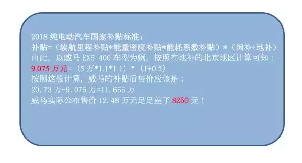 但有疑問的是,即便按照國家補(bǔ)貼來算,威馬EX5的補(bǔ)貼后售價(jià)也與實(shí)際公布的補(bǔ)貼后售價(jià)不一致。以威馬400車型為例,按照有地補(bǔ)的北京地區(qū)市場(chǎng)價(jià)格推算,補(bǔ)貼后售價(jià)應(yīng)該是11.655萬元,但威馬實(shí)際公布的補(bǔ)貼后售價(jià)是12.48萬元,兩者之間相差了8250元。