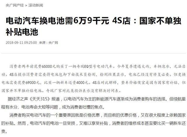 近日,央廣網(wǎng)天天315節(jié)目報道了消費(fèi)者買電動車遇到的尷尬情況。買了一輛奇瑞EQ電動汽車補(bǔ)貼后新車價格為65000元,車輛泡水后電池報廢了,更換電池竟然需要花費(fèi)69000元,比買一輛新車還貴4000元。4S店給出的解釋是:國家不單獨補(bǔ)貼電池。