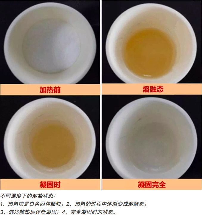 作為太陽(yáng)能光熱發(fā)電的核心技術(shù),儲(chǔ)熱材料的選擇與制備尤為重要。熔鹽就是光熱發(fā)電儲(chǔ)能材料的首選。熔鹽,其實(shí)就是鹽的熔融態(tài)液體,它具有熱容大、粘度低、蒸汽壓低、寬溫等諸多獨(dú)特的性能優(yōu)勢(shì)。
