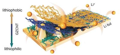 論文第一作者張慧敏介紹,團(tuán)隊(duì)巧妙設(shè)計(jì)出擁有親鋰憎鋰“雙重性格”的梯度金屬鋰保護(hù)膜,底部是具有親鋰性能的納米氧化鋅/碳納米管復(fù)合層,頂部是憎鋰強(qiáng)度高達(dá)8GPa的碳納米管層。該保護(hù)膜可以長期有效抑制鋰枝晶生長,確保電池獲得極高安全性,以及接近100%的充放電效率。