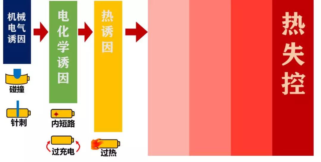 · 這就好比整個(gè)電池包的燃燒——是從一個(gè)模組蔓延開(kāi)的——而一個(gè)模組的燃燒是其中一顆電芯熱失控導(dǎo)致的——電芯的熱失控又源于電解液和正負(fù)極的燃燒——而電解液和正負(fù)極的激烈反應(yīng)又要追溯到隔膜的反應(yīng)——而引發(fā)熱失控最本源的誘因,則有三種。