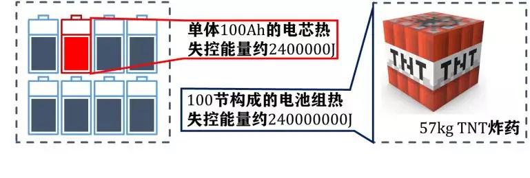 所以一旦電池的管理不當(dāng),后果會(huì)是災(zāi)難性的——即使是把電池放到太空里去,這個(gè)難題也是一樣存在。而當(dāng)鋰電池一旦發(fā)生熱失控,整個(gè)電池組能夠釋放出的能量是驚人的。由100節(jié)帶電量100Ah的電芯組成的電池組,失控能量達(dá)到240000000J,約合57公斤TNT炸藥。