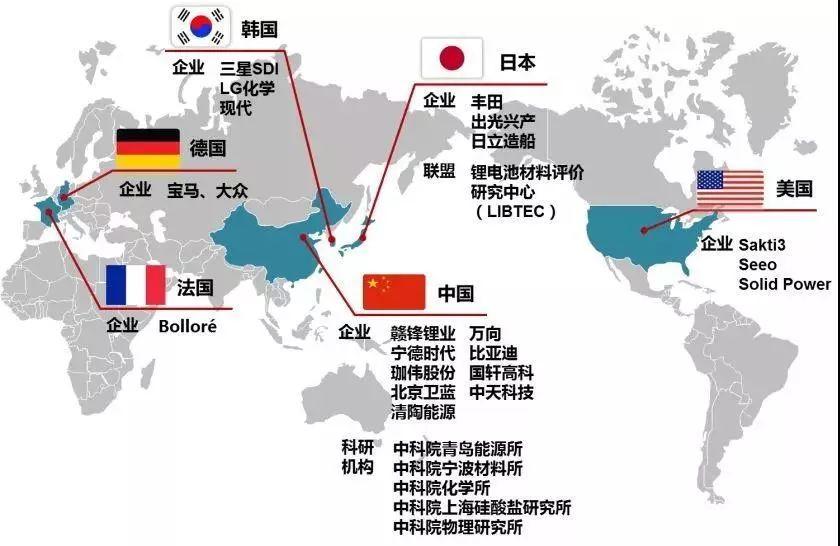 由于當(dāng)前磷酸鐵鋰和三元鋰電池自身的瓶頸,以及固態(tài)電池的潛在優(yōu)勢(shì),歐美、日韓、中國(guó)等國(guó)家的涉及動(dòng)力電池、汽車及能源方面的產(chǎn)業(yè)鏈上眾多企業(yè)正在積極布局和研發(fā)固態(tài)電池。