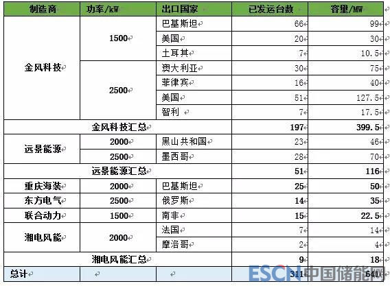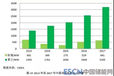 2017年,中國(guó)向國(guó)外出口風(fēng)電機(jī)組311臺(tái),容量641MW,同比增長(zhǎng)21%。截至2017年底,中國(guó)風(fēng)電機(jī)組制造企業(yè)已出口的風(fēng)電機(jī)組共計(jì)1707臺(tái),累計(jì)容量達(dá)到3205MW。