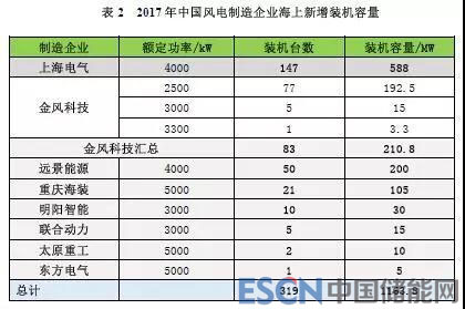 2017年,中國(guó)海上風(fēng)電取得突破進(jìn)展,新增裝機(jī)共319臺(tái),新增裝機(jī)容量達(dá)到116萬(wàn)千瓦,同比增長(zhǎng)97%;累計(jì)裝機(jī)達(dá)到279萬(wàn)千瓦。2017年共有8家制造企業(yè)有新增裝機(jī),其中,上海電氣新增裝機(jī)容量最多,共吊裝147臺(tái),容量為58.8萬(wàn)千瓦,占比達(dá)到50.5%。