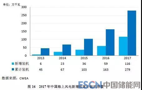 圖18 2017年中國(guó)海上風(fēng)電不同功率機(jī)組累計(jì)裝機(jī)容量