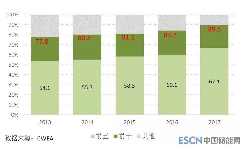 近5年,風(fēng)電整機(jī)制造企業(yè)的市場(chǎng)份額集中趨勢(shì)明顯。排名前五的風(fēng)電機(jī)組制造企業(yè)新增裝機(jī)市場(chǎng)份額由2013年的54.1%增長(zhǎng)到2017年的67.1%,增長(zhǎng)了13%;排名前十的風(fēng)電制造企業(yè)新增裝機(jī)市場(chǎng)份額由2013年的77.8%增長(zhǎng)到2017年的77.8%增長(zhǎng)到2017年的89.5%,增長(zhǎng)了12%。