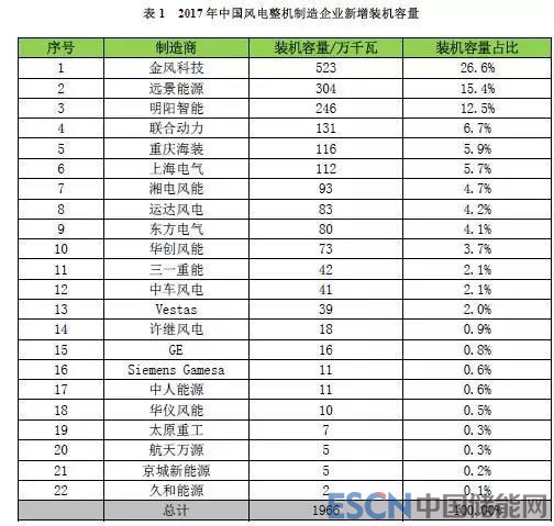 2017年,中國(guó)風(fēng)電統(tǒng)計(jì)有新增裝機(jī)的整機(jī)制造企業(yè)共22家,新增裝機(jī)容量1966萬(wàn)千瓦,其中,金風(fēng)科技新增裝機(jī)容量達(dá)到523萬(wàn)千瓦,市場(chǎng)份額達(dá)到26.6%;其次為遠(yuǎn)景能源、明陽(yáng)智能、聯(lián)合動(dòng)力和重慶海裝,前五家市場(chǎng)份額合計(jì)達(dá)到67%。