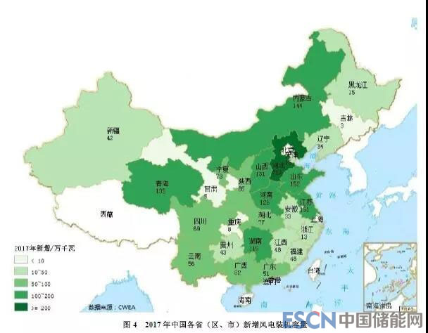 2017年,中國(guó)六大區(qū)域的風(fēng)電新增裝機(jī)容量所占比例分別為華北(25%)、中南(23%)、華東(23%)、西北(17%)、西南(9%)、東北(3%)?!叭薄钡貐^(qū)新增裝機(jī)容量占比為45%,中東南部地區(qū)新增裝機(jī)容量占比達(dá)到55%。
