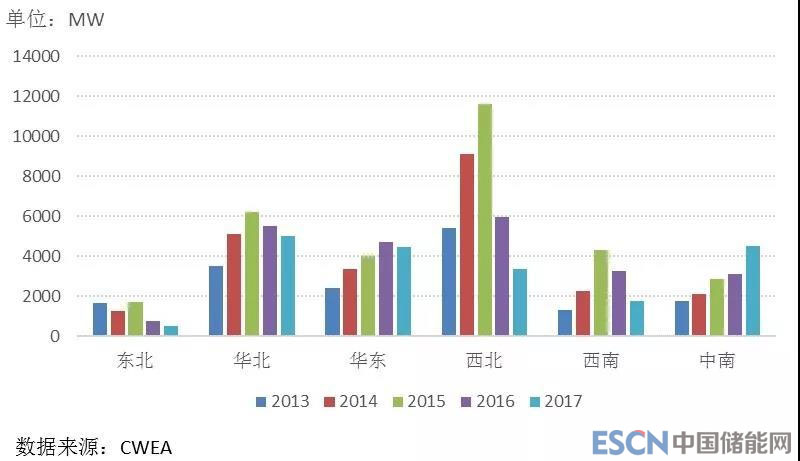 圖3 2013年至2017年中國(guó)各區(qū)域新增風(fēng)電裝機(jī)容量趨勢(shì)