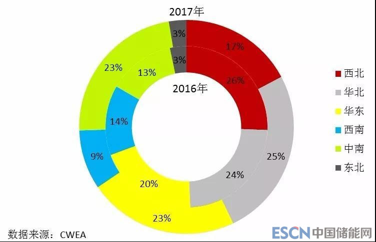 圖2 2016年和2017年中國(guó)各區(qū)域新增風(fēng)電裝機(jī)容量占比情況