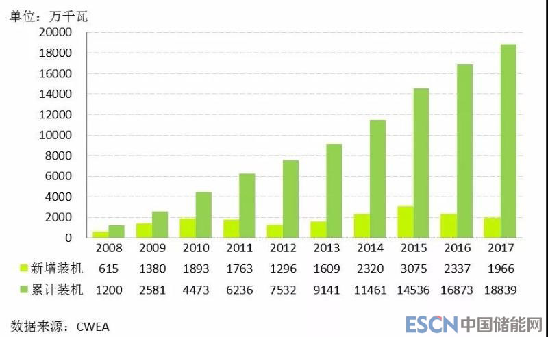 圖1 2008年至2017年中國(guó)新增和累計(jì)風(fēng)電裝機(jī)容量