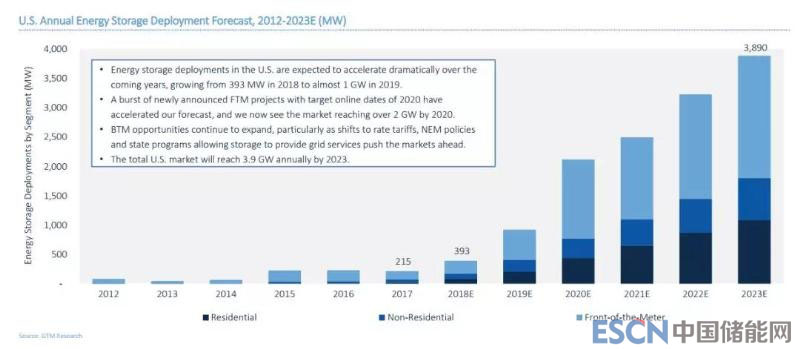 預(yù)計(jì)美國(guó)的儲(chǔ)能部署未來(lái)幾年將大幅加速,將從2018年393兆瓦增長(zhǎng)到2019年的近1吉瓦。
