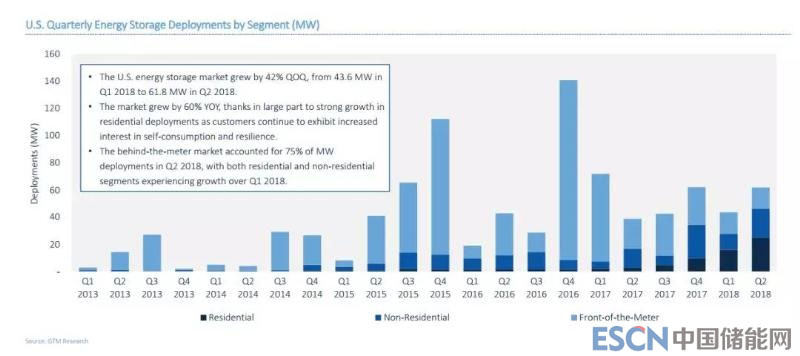 美國(guó)的儲(chǔ)能市場(chǎng)劃分為電表前和電表后,其中電表后又包括非戶用市場(chǎng)以及戶用市場(chǎng)。從2018年第二季度的數(shù)據(jù)來(lái)看,電表后儲(chǔ)能市場(chǎng)份額比重持續(xù)在提升。在2018年第二個(gè)季度,按功率計(jì),電表后儲(chǔ)能部署占據(jù)2018年第二季度儲(chǔ)能市場(chǎng)的75%,按容量計(jì),電表后儲(chǔ)能部署占據(jù)2018年第二季度儲(chǔ)能市場(chǎng)容量的近2/3。