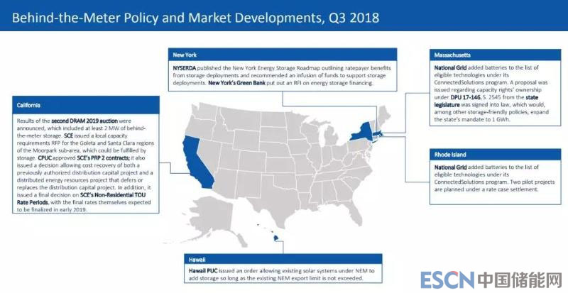 2018年第三季度,包括聯(lián)邦政府以及多個(gè)州均有儲(chǔ)能動(dòng)態(tài)發(fā)布。其中電表前儲(chǔ)能已經(jīng)受到美國(guó)聯(lián)邦政府肯定。美國(guó)國(guó)會(huì)眾議院能源和商務(wù)委員會(huì)舉行了關(guān)于儲(chǔ)能的聽(tīng)證會(huì)。在一項(xiàng)關(guān)于能源和水的撥款法案里,儲(chǔ)能被作為技術(shù)優(yōu)先事項(xiàng),以及重要的靈活性工具加以強(qiáng)調(diào)。
