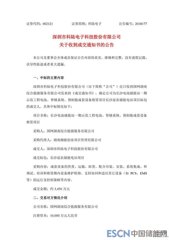 中國(guó)儲(chǔ)能網(wǎng)訊:10月8日晚間,科陸電子發(fā)布公告稱(chēng),公司近日收到國(guó)網(wǎng)湖南綜合能源服務(wù)有限公司發(fā)來(lái)的《成交通知書(shū)》,確定公司為長(zhǎng)沙電池儲(chǔ)能站一期示范工程電池、智輔系統(tǒng)、預(yù)制艙成套設(shè)備租賃項(xiàng)目長(zhǎng)沙延農(nóng)儲(chǔ)能電站項(xiàng)目標(biāo)包的成交人,成交金額約3,450萬(wàn)元。