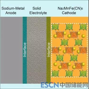 在此基礎(chǔ)上,Goodenough團(tuán)隊(duì)選擇了鈉離子固態(tài)導(dǎo)體NASICON作為固態(tài)電解質(zhì)組裝了高比能全固態(tài)Na/NASICON/Na2MnFe(CN)6鈉電池[6]。固態(tài)電解質(zhì)的應(yīng)用從根本上抑制了晶格水與液態(tài)電解液在高電位下的副反應(yīng),過渡金屬離子也不再與電解液溶劑配位溶解。相比液態(tài)電池體系,固態(tài)電池的鈉負(fù)極界面上由于副反應(yīng)減少而保持著良好的離子傳輸,相應(yīng)的電池庫倫效率和循環(huán)穩(wěn)定性都有明顯的改善。