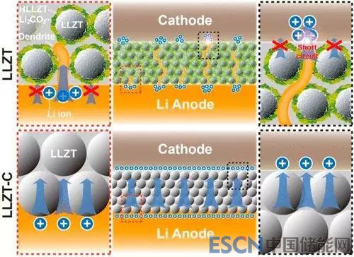 Goodenough 先生及其團(tuán)隊(duì)通過對(duì)LLZTO陶瓷電解質(zhì)進(jìn)行高溫碳處理(LLZTO-C)成功地解決了其界面兼容性不佳的難題[4]。