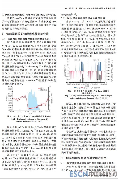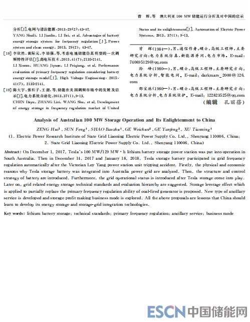 中國儲能網(wǎng)訊:2017年12月1日,100 MW/129 MW·h 特斯拉鋰電池儲能電站在澳大利亞南澳州投運,并于2017年12月14日和2018年1月18日維多利亞州的LoyYang發(fā)電站機組跳閘事故中跨區(qū)參與電網(wǎng)調(diào)頻。首先,分析了特斯拉(Tesla)儲能電池投入澳大利亞電網(wǎng)運行的物理和經(jīng)濟原因,介紹電池的結(jié)構及控制策略,Tesla儲能投運后的運行狀況;然后,從制定中國儲能參與電網(wǎng)運行技術標準和評價體系、發(fā)揮儲能部分替代火電機組一次調(diào)頻的能力、借鑒國外快速調(diào)頻輔助服務模式、探索儲能自盈利商業(yè)模式等角度深入探討Tesla儲能運行對中國儲能技術及電網(wǎng)的啟示和借鑒意義。