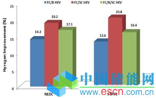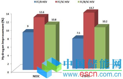 燃料電池/超級(jí)電容型燃料電池汽車的節(jié)能優(yōu)勢主要來自于它可以在瞬態(tài)工況下頻繁地使用高效率的超級(jí)電容進(jìn)行充放電(超級(jí)電容所允許的最大充放電流遠(yuǎn)高于常規(guī)電池)。所以盡管它的車重往往更高,但是仍然更加節(jié)能。