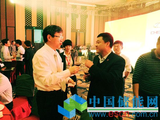 圖為奇瑞公司董事長尹同躍(左)與天能集團副總裁周建中(右)在年會上親切交談