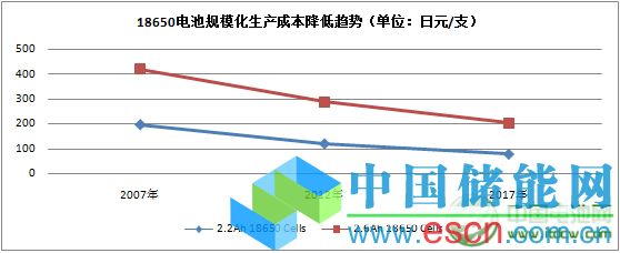 規(guī)模化生產電池價格降低趨勢(以18650電池為例)