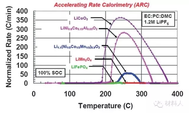 鋰電池電極材料的安全性能是鋰電池的一個重要的評價指標,也是決定鋰電池品質(zhì)是否過關的一個重要因素。安全性能往往體現(xiàn)在熱穩(wěn)定性上面,如圖2所示:同等條件下,鈷酸鋰的熱穩(wěn)定性最差,NCA、NCM次之,錳酸鋰熱穩(wěn)性較好,磷酸鐵鋰熱穩(wěn)定性最好。