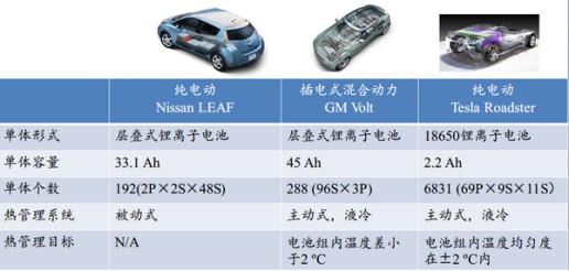以三款經(jīng)典的電動(dòng)汽車日產(chǎn)LEAF、雷諾和特斯拉為例,三家汽車廠商基于產(chǎn)品的定位、電池技術(shù)掌握程度等多方面的因素,選擇的電池種類、容量、個(gè)數(shù)和熱管理系統(tǒng)就大相徑庭(詳情參見(jiàn)下圖)。特斯拉的優(yōu)勢(shì)在于電池管理系統(tǒng),短板在于單體電池領(lǐng)域的積累不足,因而選擇直接從松下購(gòu)買技術(shù)成熟度高、一致性好的18650型電池;而日產(chǎn)從材料解析到單體電池設(shè)計(jì)再到模組管理都有豐富的經(jīng)驗(yàn),因而選擇容量較大的層疊式鋰離子電池。