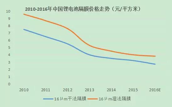 就具體價(jià)格來(lái)看,在新增產(chǎn)能的沖擊下,國(guó)產(chǎn)隔膜價(jià)格出現(xiàn)了快速下滑,近五年,國(guó)產(chǎn)16μm濕法隔膜市場(chǎng)均價(jià)為從2010年的9.5元/平米下降到2015年為4元/平米;16μm干法隔膜均價(jià)從2010年的7.5元/平米下降到2015年的3.5元/平米,跌幅均超過(guò)了50%。隔膜價(jià)格大幅下滑主要是由于國(guó)內(nèi)中低端產(chǎn)能迅速擴(kuò)張,隔膜企業(yè)采用低價(jià)競(jìng)爭(zhēng)戰(zhàn)略占據(jù)市場(chǎng);此外,下游電芯行業(yè)也存在中低端產(chǎn)能過(guò)剩和無(wú)序競(jìng)爭(zhēng)問(wèn)題,為低端低價(jià)格隔膜產(chǎn)品提供了生存土壤。