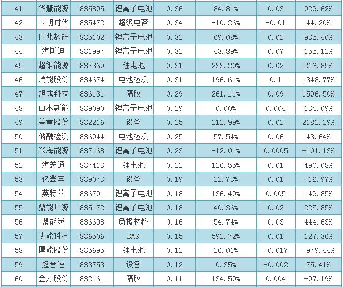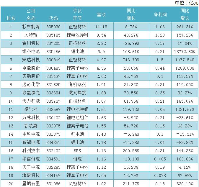 鋰電池營業(yè)收入排名前10的鋰電池新三板公司分別是杉杉能源、貝特瑞、金川科技、維科電池、安達(dá)科技、卓能股份、天勁股份、邁奇化學(xué)、聯(lián)贏激光、天力鋰能。