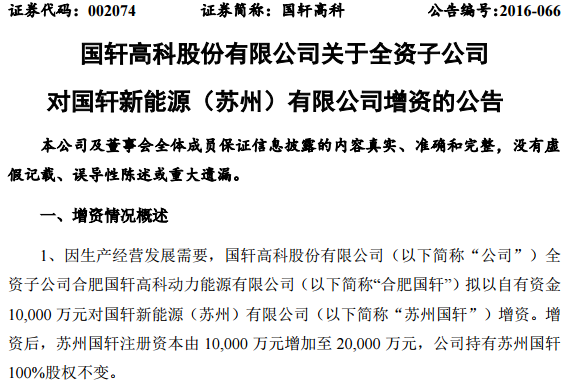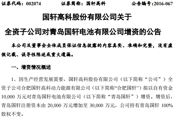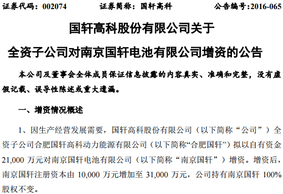 同時,國軒高科還公告,子公司合肥國軒擬以自有資金增資青島國軒電池有限公司(以下簡稱“青島國軒”)、南京國軒電池有限公司(以下簡稱“南京國軒”)、國軒新能源(蘇州)有限公司(以下簡稱“蘇州國軒”)各1億元:合肥國軒擬以自有資金10,000萬元對青島國軒增資。增資后,青島國軒注冊資本由20,000萬元增加至30,000萬元,公司持有青島國軒100%股權(quán)不變;合肥國軒擬以自有資金21,000萬元對南京國軒增資。增資后,南京國軒注冊資本由10,000萬元增加至31,000萬元,公司持有南京國軒100%股權(quán)不變;合肥國軒擬以自有資金10,000萬元對蘇州國軒增資。增資后,蘇州國軒注冊資本由10,000萬元增加至20,000萬元,公司持有蘇州國軒100%股權(quán)不變。