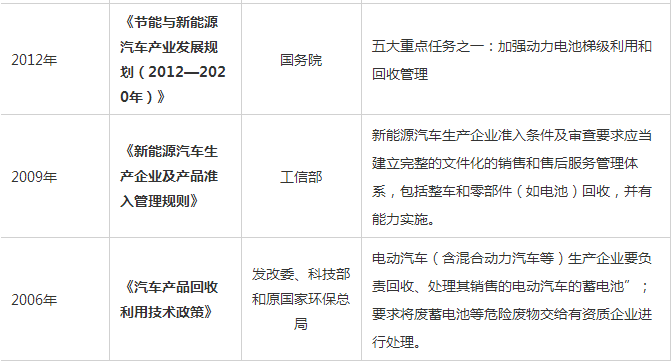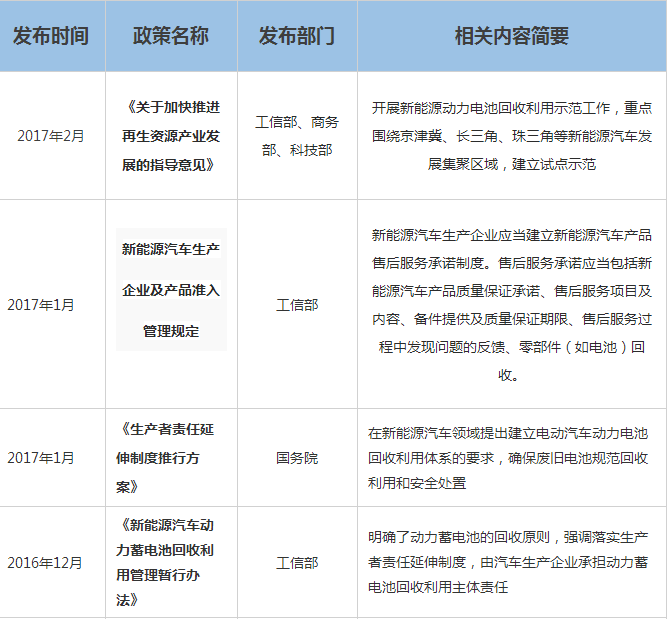 隨著動(dòng)力電池回收問(wèn)題日益顯現(xiàn),國(guó)家的相關(guān)政策開(kāi)始落實(shí),只2017年國(guó)家就連續(xù)發(fā)布了3個(gè)相關(guān)政策,督促電池回收發(fā)展。前不久,三部委下發(fā)《關(guān)于加快推進(jìn)再生資源產(chǎn)業(yè)發(fā)展的指導(dǎo)意見(jiàn)》,將在京津冀、長(zhǎng)三角、珠三角等新能源汽車發(fā)展集聚區(qū)域,建立試點(diǎn)示范;1月份,工信部頒布《新能源汽車生產(chǎn)企業(yè)及產(chǎn)品準(zhǔn)入管理規(guī)定》明確了新能源汽車產(chǎn)品售后服務(wù)承諾制度,其中特別標(biāo)注了電池回收;同月,國(guó)務(wù)院頒布《生產(chǎn)者責(zé)任延伸制度推行方案》,明確了“誰(shuí)生產(chǎn),誰(shuí)負(fù)責(zé)”的原則。