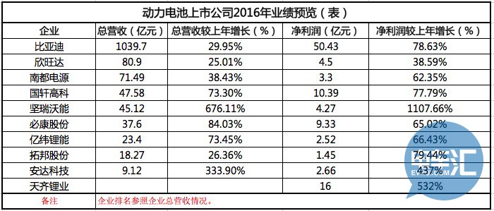 根據(jù)統(tǒng)計(jì),截至2017年2月23日,122家公布2016年年報(bào)業(yè)績(jī)預(yù)告的鋰電池公司中,按照預(yù)告凈利潤(rùn)最大變動(dòng)幅度來(lái)看,近八成企業(yè)實(shí)現(xiàn)了凈利潤(rùn)增長(zhǎng)。其中,預(yù)告凈利潤(rùn)最大增幅度同比超過(guò)100%的企業(yè)達(dá)到48家;預(yù)告凈利潤(rùn)上限超1億元的企業(yè)高達(dá)68家。印證了2016年在新能源汽車(chē)產(chǎn)銷(xiāo)突破50萬(wàn)輛的大背景下,新能源汽車(chē)產(chǎn)業(yè)鏈尤其是鋰電池產(chǎn)業(yè),一片欣欣向榮的發(fā)展勢(shì)頭。