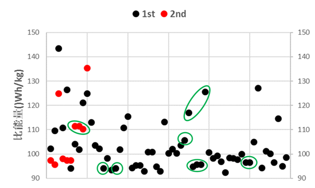 首先還是看一下目前鋰離子電池系統(tǒng)比能量的情況,數(shù)據(jù)來源于2017年《新能源汽車推廣應(yīng)用推薦車型目錄》已經(jīng)發(fā)布了兩批目錄中的乘用車的情況,主要看一下公開的純電動乘用車電池系統(tǒng)數(shù)據(jù)(目錄中的乘用車數(shù)量相對很少,電動大巴數(shù)量遠(yuǎn)超乘用車,還有些乘用車對應(yīng)的電池數(shù)據(jù)在目錄參數(shù)中沒有標(biāo)注),見圖1:黑色圓點是第一批目錄中的數(shù)據(jù),紅色圓點是第二批目錄中的數(shù)據(jù),數(shù)據(jù)包括了采用鎳鈷錳酸鋰(NCM)、錳酸鋰(LMO)和磷酸亞鐵鋰(LFP)正極材料的電池,其中,LFP的數(shù)據(jù)用藍(lán)色圓圈標(biāo)示出來了。