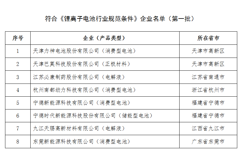 以下為符合《鋰離子電池行業(yè)規(guī)范條件》的第一批企業(yè)名單