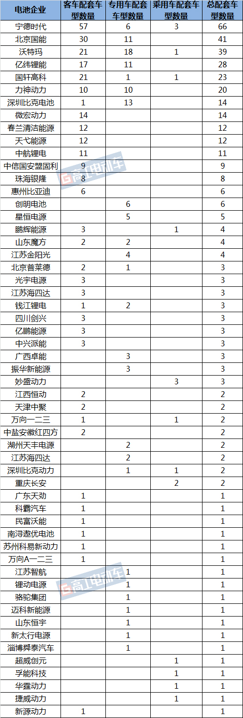 而按照配套車型的數(shù)量統(tǒng)計,本次進入申報公告的電池企業(yè)共有55家,配置車型數(shù)量排名前五的分別為寧德時代(66款)、北京國能(41款)、沃特瑪(39款)、億緯鋰能(28款)和國軒高科(23款)。