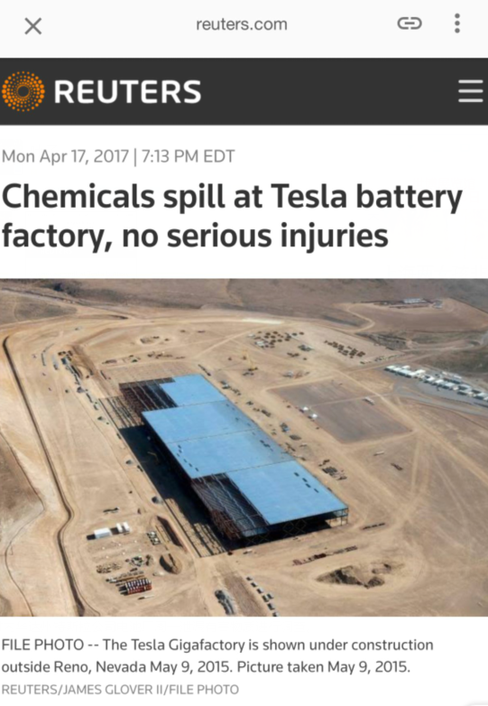 特斯拉還表示,緊急工作人員正在對內(nèi)華達(dá)州特斯拉公司電池廠周一泄漏有害物質(zhì)進(jìn)行調(diào)查。