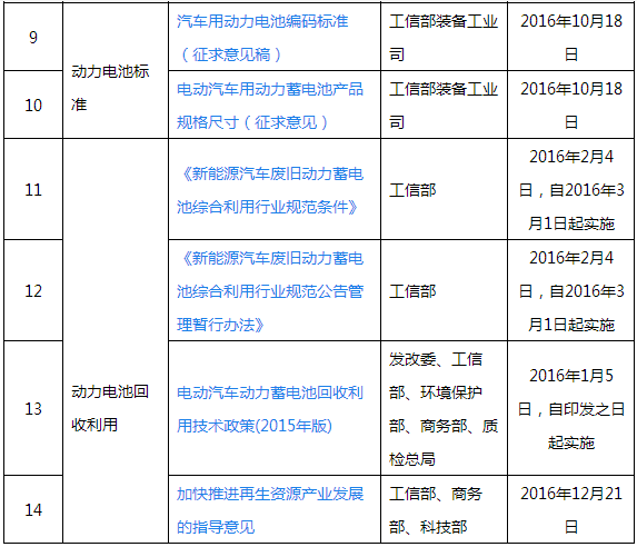 2016年2月4日,工信部發(fā)布《新能源汽車廢舊動力蓄電池綜合利用行業(yè)規(guī)范條件》。條件規(guī)范了廢舊動力電池綜合利用企業(yè)布局與項目建設(shè)條件、規(guī)模、裝備和工藝、資源綜合利用及能耗、環(huán)境保護(hù)要求、產(chǎn)品質(zhì)量和職業(yè)教育、產(chǎn)品質(zhì)量和職業(yè)教育等方面,規(guī)范條件自 2016 年 3 月 1 日起施行。